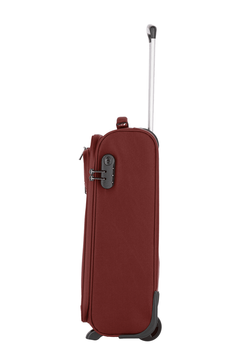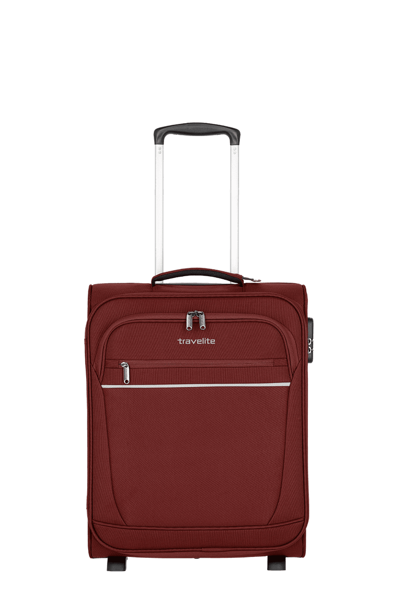 Ideal als Handgepäckstück: der Cabin von travelite. Der Weichgepäcktrolley besteht aus besonders widerstandsfähigem Polyester und wurde für den Einsatz als Bordgepäck entwickelt. Dank seiner kompakten Abmessungen ist er bei vielen Fluggesellschaften als Handgepäck einsetzbar. In den zwei großen Vortaschen finden die Bordkarten oder eine leichte Jacke Platz. Im Inneren überzeugt das Innenfutter in Kombination mit praktischen Packgurten, die Kleidung und Co. sicher an Ort und Stelle halten. Darüber hinaus gibt es ein zusätzliches Hemdenfach mit Reißverschluss im Deckel. Abgesichert wird das Hauptfach mit einem Kombinationsschloss, das vor Eingriffen von außen schützt. Dank der zwei Komfortrollen und des Teleskopgestänges lässt sich der Trolley ganz einfach über verschiedenste Untergründe ziehen. Cabin – einfach perfekt als Begleitung an Bord!