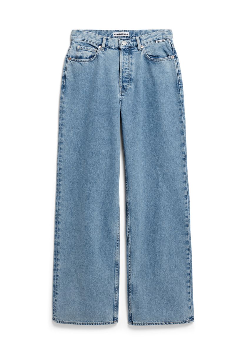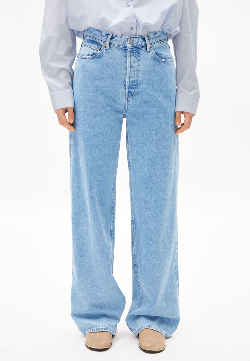 Our ENIJAA jeans are defined by their high-waist cut and wide-leg silhouette, designed to highlight the waist and create the appearance of longer legs. Crafted from 100% recycled cotton, they feature a rigid, non-stretch fabric that remains comfortable—perfect for achieving an authentic denim look.