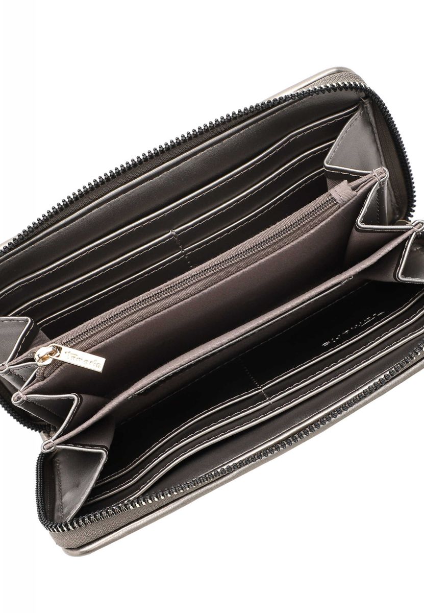 Tolle Accessoires für stilsichere Frauen Ein auffälliges Accessoire, das beim Bezahlen an der Kasse einfach jeden begeistert. Die Geldbörse TAS Charis kommt aus Feinsynthetik mit Emblem und bietet genug Platz für Karten und Bargeld. Das Modell besteht aus Feinsynthetik und lässt sich mit einem Reißverschluss verschließen. Ein optisches Highlight ist die Geldbörse mit Steppstich-Optik und wattiert. Bei Tamaris finden alle genau das, was sie sich wirklich wünschen. Die Geldbörse hat ein übersichtliches Hauptfach. Für alle, die eine weiche Haptik lieben - TAS Charis ist angenehm anschmiegsam. Ein Emblem schmückt optisch und hebt das besondere Design dieses neuen Favoriten hervor. Perfekt für den Abend mit der Clique oder eine aufregende Party. In die hübsche Geldbörse passen Geldbörse, Handy und ein Lippenstift - also alles, was eine Frau beim Ausgehen dabei haben muss. Das Portemonnaie besitzt ein Reißverschluss-Münzfach, 8 Kreditkartenfächer und Scheinfächer.