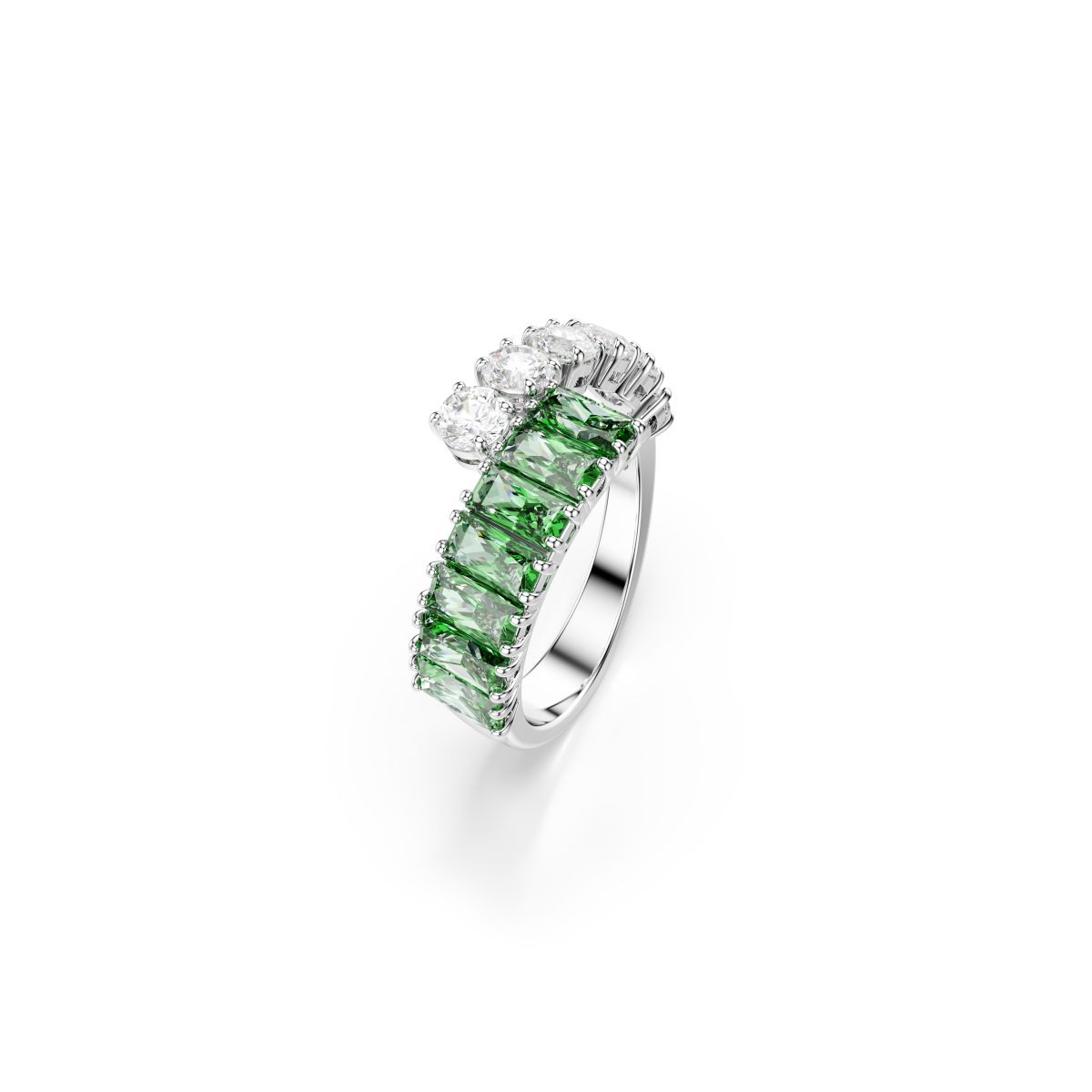 Beschreibung: Dieser hypnotische Bandring präsentiert eine wundervolle Kombination an Farben und Formen. Das sich überschneidende, rhodinierte Design präsentiert klare und grüne Swarovski Zirconia im Rund- und Baguette-Schliff. Ein strahlendes Schmuckstück, das besonders in Kombination mit dem dazu passenden Armreif und den Ohrringen zur Geltung kommt.; Familie: Matrix; Max. Länge: 2,4 cm; Effektive Länge: 23,7 mm