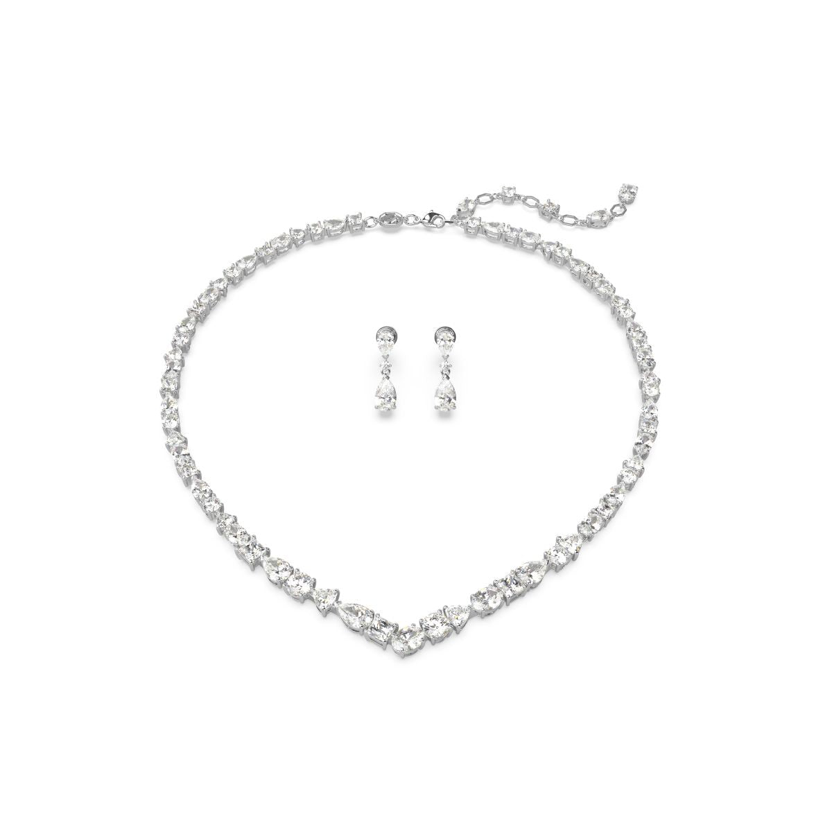 Beschreibung: Exquisite Raffinesse wird in diesem atemberaubenden Schmuckset der Mesmera Familie zum Leben erweckt. Die Halskette besteht aus einer Reihe auffälliger Swarovski Zirkonia auf einer rhodinierten Fassung, die in einer überraschenden Fülle an Schliffen und Größen glänzen. Für zusätzlichen Luxus sorgt das Verlängerungsstück mit einem Karabinerverschluss und einer Fülle von Swarovski Zirkonia. Die Ohrringe fangen das Licht ein und glänzen mit einer rhodinierten Fassung. Das gewagte hängende Design zeichnet sich zudem durch leuchtende Kristalle im Tropfenschliff aus. Schenken Sie dieses Set einer geliebten Person, um ihren Style sofort zu entfachen.; Familie: Mesmera