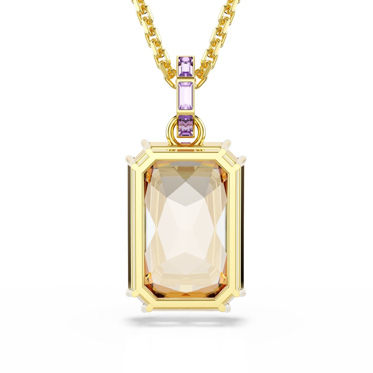 Beschreibung: Dieser leuchtende Millenia Anhänger verströmt Wärme und Luxus. Der zentrale Hingucker, ein großes, karamellfarbenes Kristallelement in doppelter Krappenfassung, ist über eine elegante Öse mit kanalgefassten, violetten Kristallen mit der Kette in Goldlegierungsschicht verbunden. Kombinieren Sie diesen Anhänger mit den dazu passenden Ohrringen oder einem Armreif für einen ultra-modernen Look.; Familie: Millenia; Max. Länge: 65,0 cm; Effektive Länge: 650,0 mm; Anhänger: 4,1 x 1,9 cm