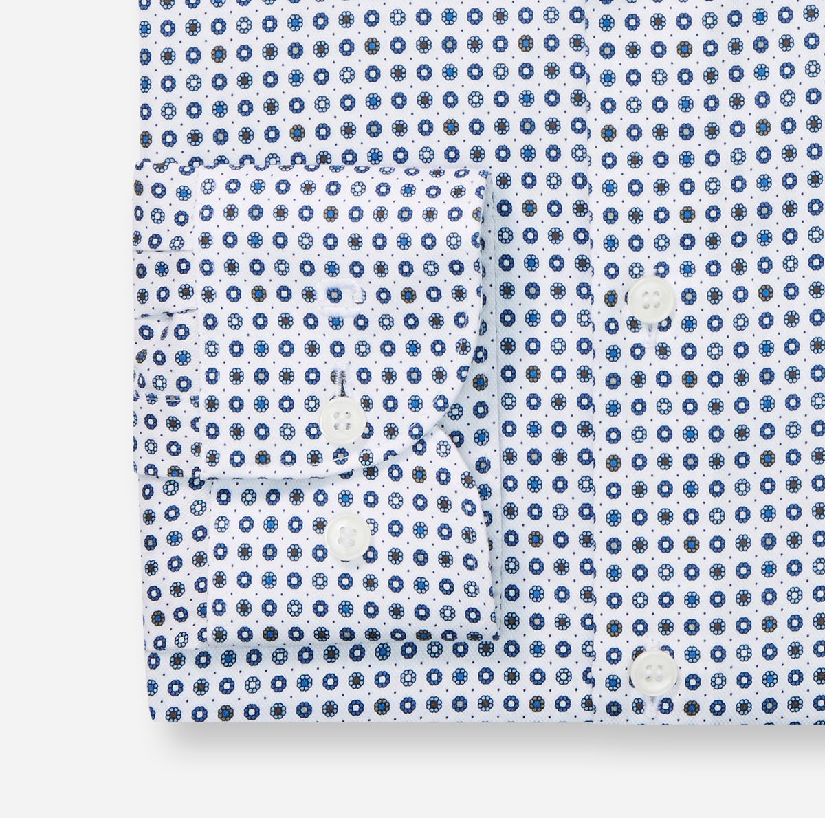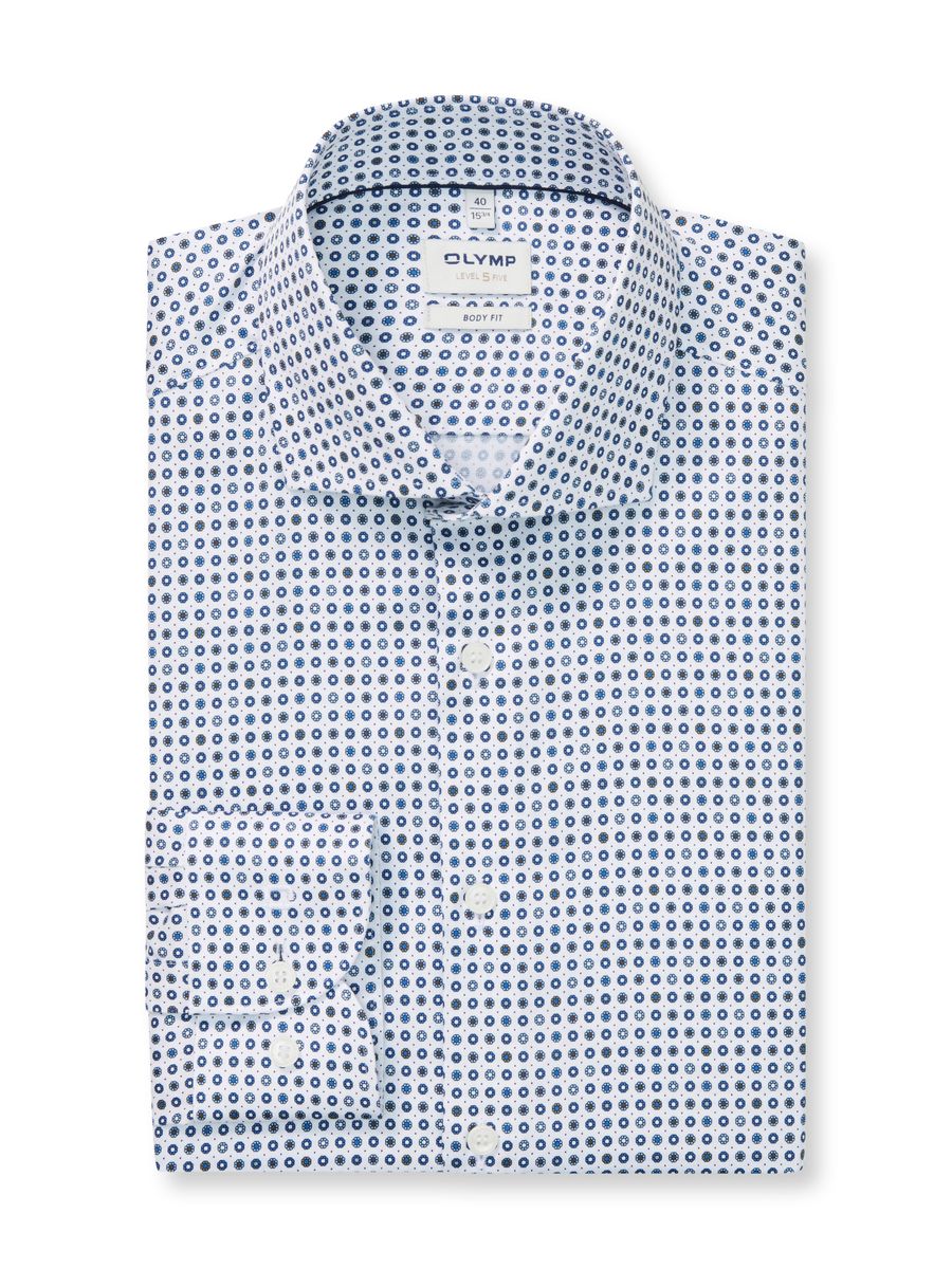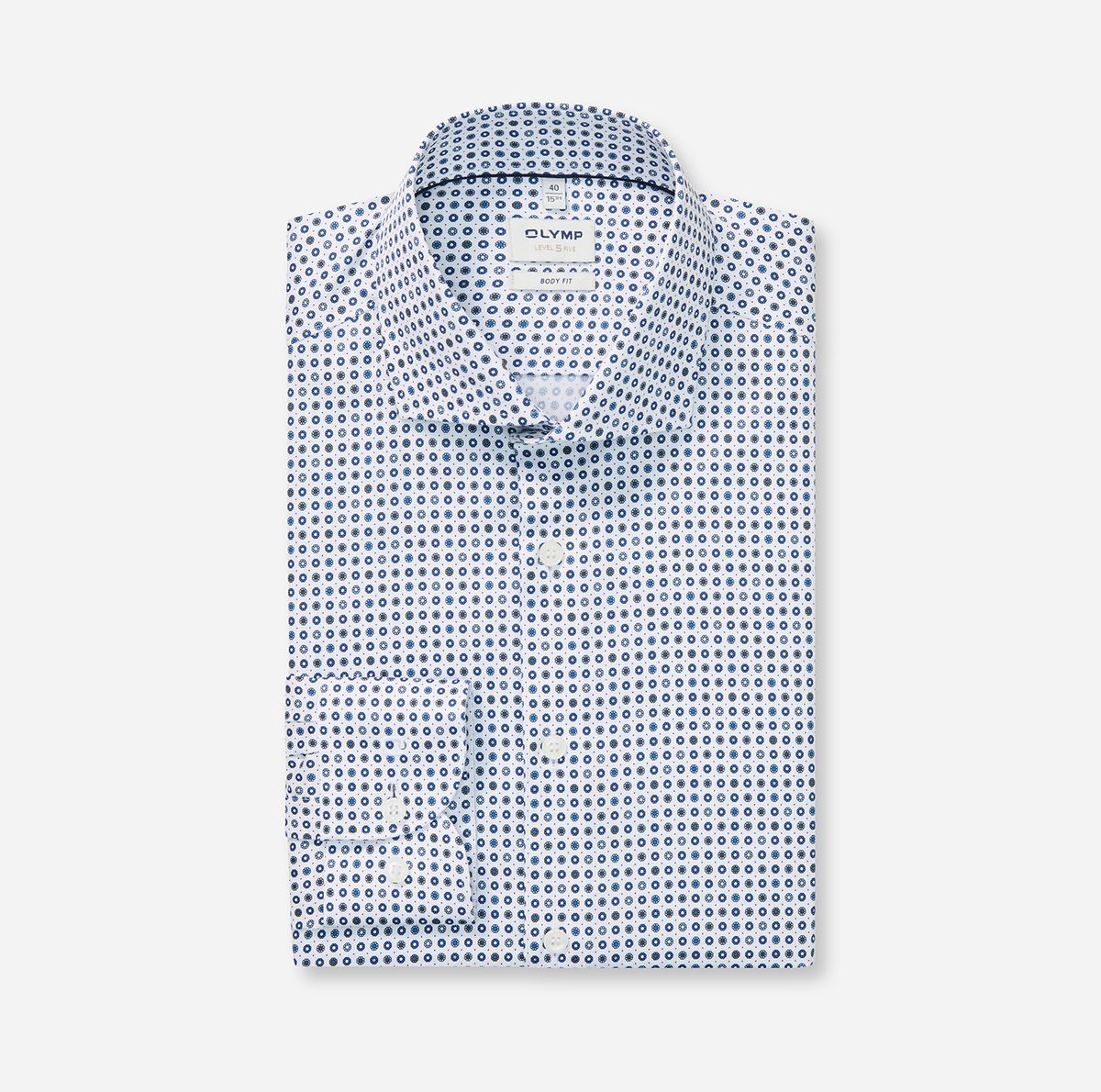 Das angenehm glatte Level Five body fit Businesshemd aus dehnbarem Comfort Stretch ist formstabil, hautsympathisch und besonders pflegeleicht. Mit grafischem Minimal-Dessin unterstreicht es die modische Performance im Office dezent und wirkungsvoll zugleich. Stilvoll und lässig, mit maskulinem Royal Kent und gerundetem Saum.