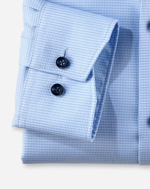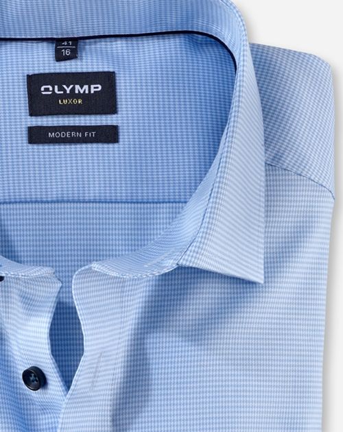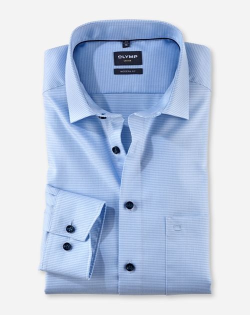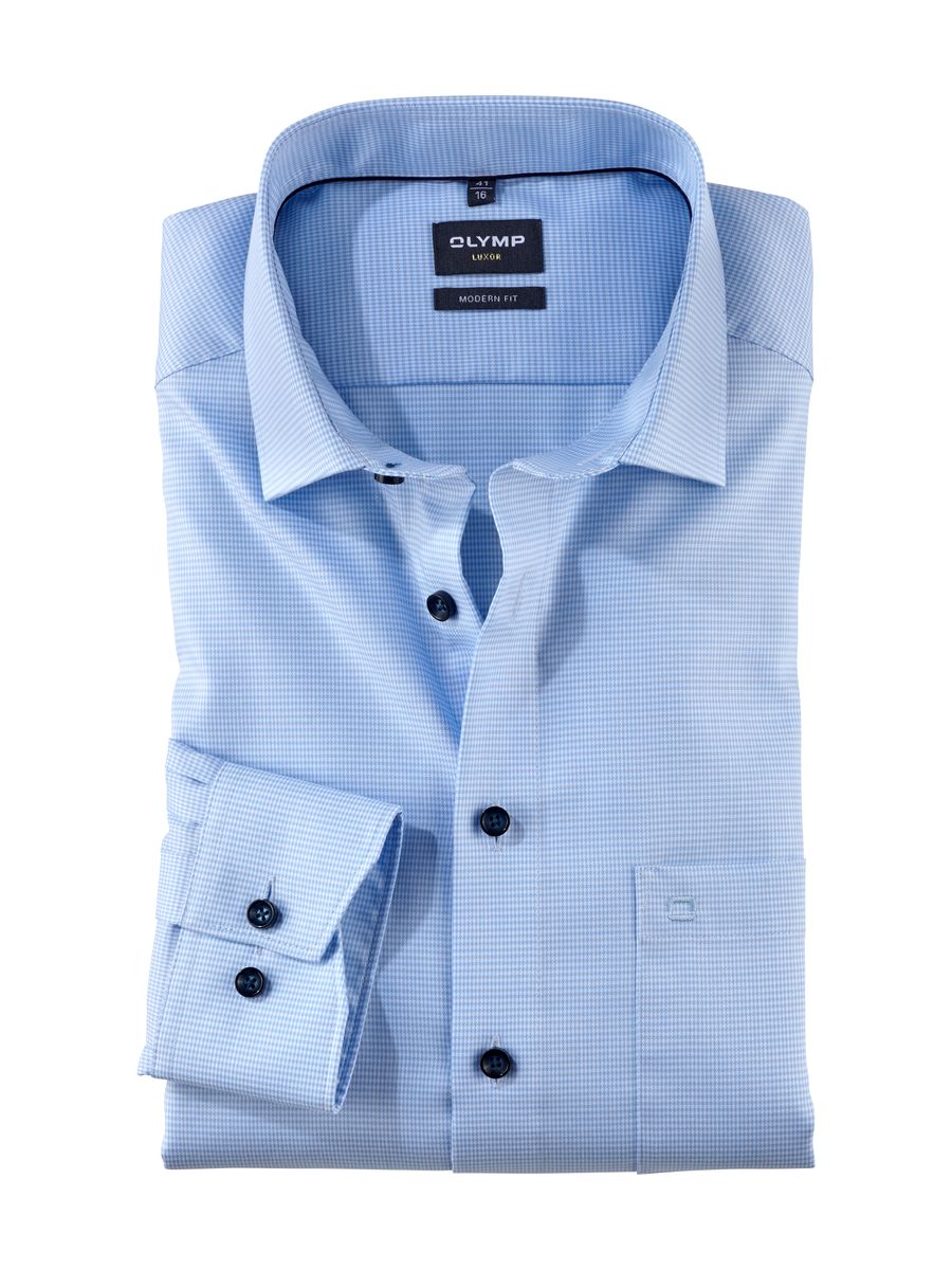 Faux-Uni-Texturen begeistern durch die intensive Uni-Farbwirkung und bei näherem Hinsehen durch das besonders feine, leicht changierende Webmuster. Es verschafft diesem OLYMP Luxor modern fit den edlen Look. Körperbetont geschnitten, weltoffener Global Kent, zeitsparend bügelfrei.
