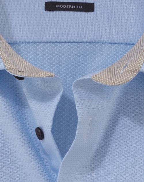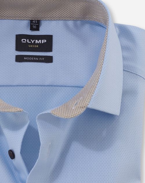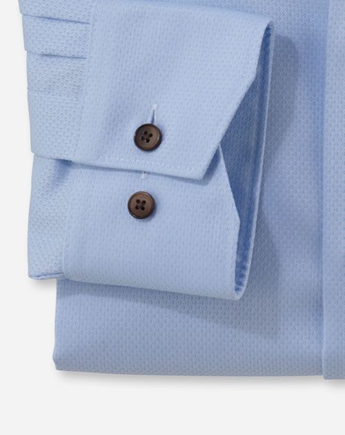 Klassischer Dresscode in sportiver Linienführung. Das OLYMP Luxor modern fit Men's Club Businesshemd in Bleu überzeugt mit edlen Strukturen, Changé-Effekt und akzentuierten Knöpfen in Braun. Feine Baumwollgarne sorgen für den hohen Tragekomfort und unnachahmlichen Griff. Pflegeleichtes und bügelfreies Handling. Weltoffener Global Kent.