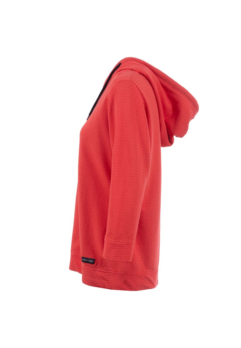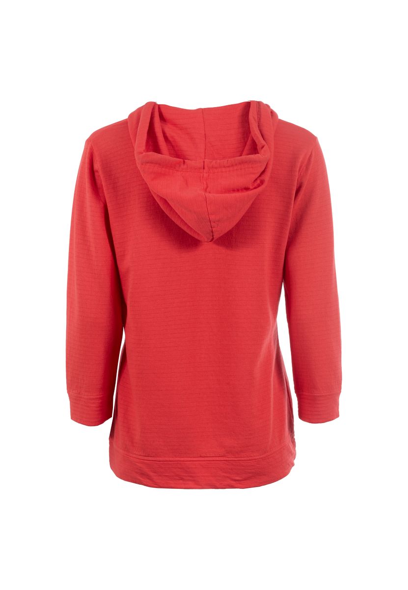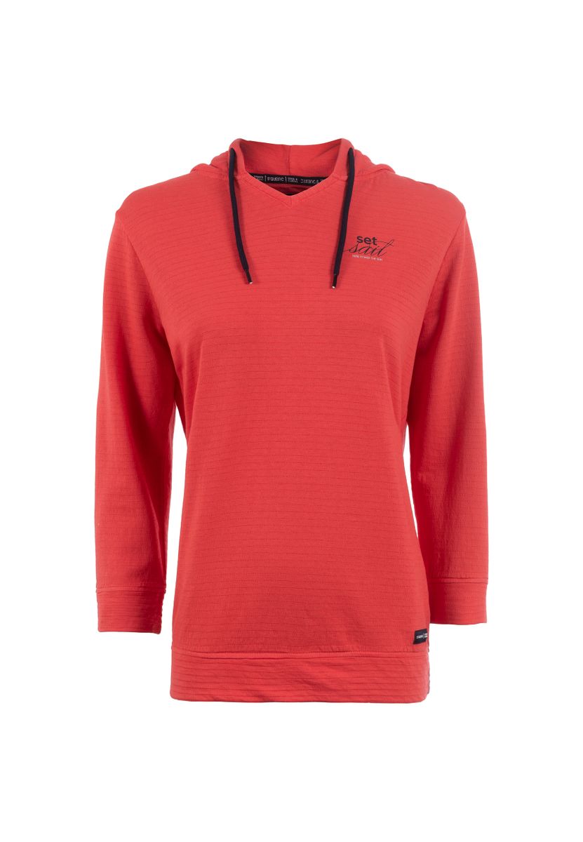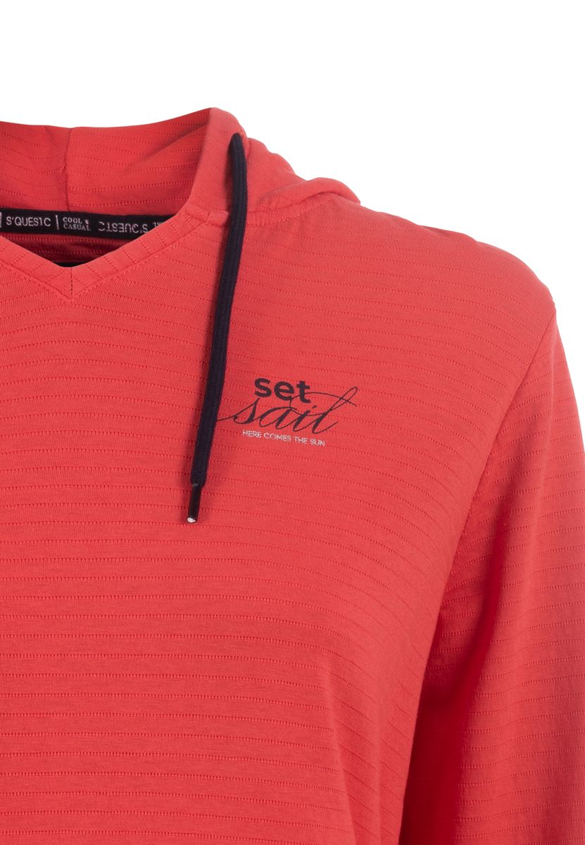 Das einzigartige Shirt mit Kapuze und Kordeln vereint einen lässigen Look mit hoher Detailverliebtheit. Neben der Kapuze machen auch zarte Streifen in der Oberfläche das Shirt besonders. Ein kleiner Lettering-Print in Farbe der Kordeln rundet das Bild ab.