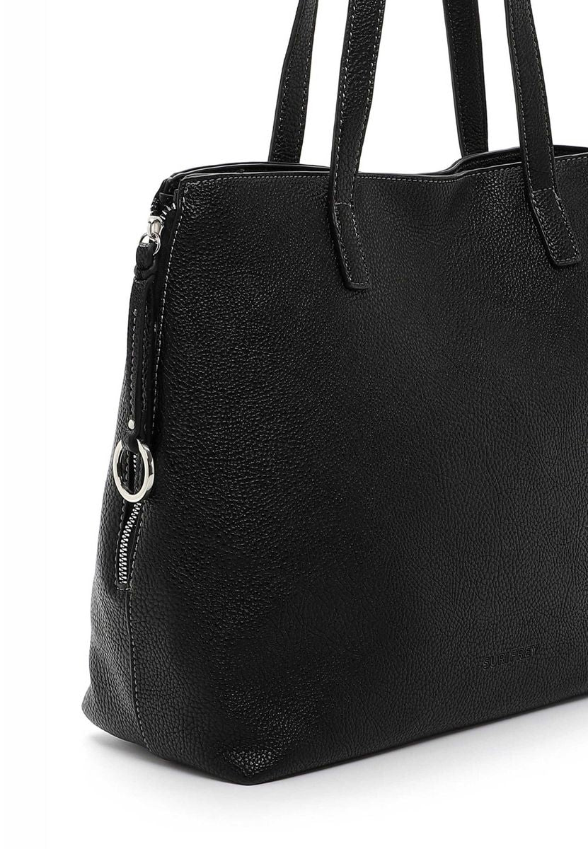 SURI FREY - die Marke für “freye" Frauen Eine Handtasche zeigt die Persönlichkeit einer Frau. Ob aufgeräumt oder etwas chaotisch - sie wird einfach heißgeliebt! Der Shopper SFY Debby kommt in Uni-Design mit Druckknopf und sieht einfach toll aus. Ob für Office, Schule oder in der Freizeit - mit ihm lässt sich jedes Abenteuer bestreiten. SURI FREY ist bekannt für ihre tierfreundlichen Styles und Designs. Die Marke setzt ausschließlich auf vegane Inhaltsstoffe und darf außerdem das „PETA-Approved Vegan“-Logo führen, welches ausschließlich an Unternehmen vergeben wird, welche durch die PETA zertifiziert wurden. Das Modell besteht aus Feinsynthetik und lässt sich mit einem Druckknopf verschließen. Die strukturierte Optik und das Uni-Design sind fein gearbeitet und verleihen dem Shopper einen edlen Look. Wer viel auf Achse ist, will einfach immer gut aussehen. SURI FREY hat genau die Accessoires, die Frauen lieben und die jedes Outfit mit Stil vervollständigen. Ordnung ist das halbe Leben. Ein übersichtliches Hauptfach und eine Reißverschluss-Mittelwand sind in der Tasche integriert. Ein Reißverschlussfach sichert Portemonnaie, Handy und andere wichtige Dinge vor Langfingern z. B. in der vollen Straßenbahn oder im Gewimmel in der Fußgängerzone. Dank eines Rückfaches mit Reißverschluss hat man weiteren Stauraum und leichten Zugriff auf alle wichtigen Dinge. Für alle, die eine weiche Haptik lieben - SFY Debby ist angenehm anschmiegsam. Für das gewisse Extra sorgt die Applikation mit der Logo-Prägung, die einen zusätzlichen Akzent setzt. Als Schultertasche ist dieses Modell den zwei Tragegriffen zu tragen. Viel Platz für alles, was man als Frau so mit sich herumträgt, bietet der Shopper.