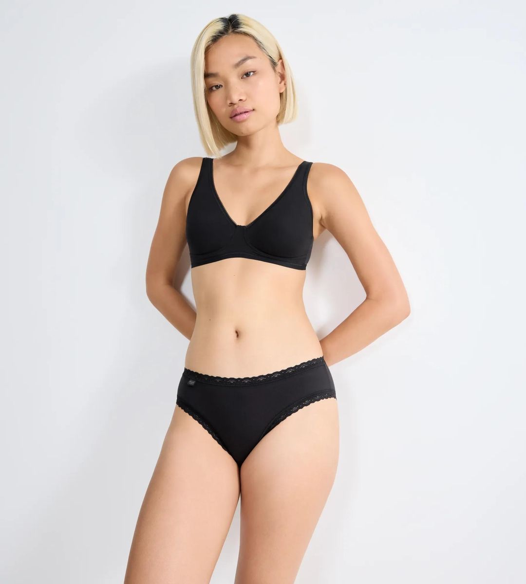 Hochkomfortable hüftig geschnittene Slips aus weicher Baumwolle mit edler Spitze im Dreierpack. Der perfekte Slip für jeden Tag mit angenehm natürlichem Tragegefühl. Moderner Schnitt, pflegeleicht und blickdicht bei höchster Qualität. Hipster Panty im 3er Pack. Oeko Tex Standard 100 zertifiziert.
