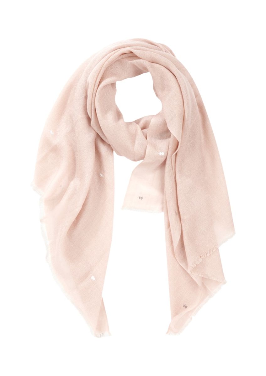 schmal gesteppte seitliche Kanten, offen gearbeitete Enden mit kurzen Fransen, dezente, silbrig glänzende Printdetails geben dem Schal den letzten modischen Schliff, Maße des Schals ca. 185 cm x 70 cm, aus weichen Mischgarnen